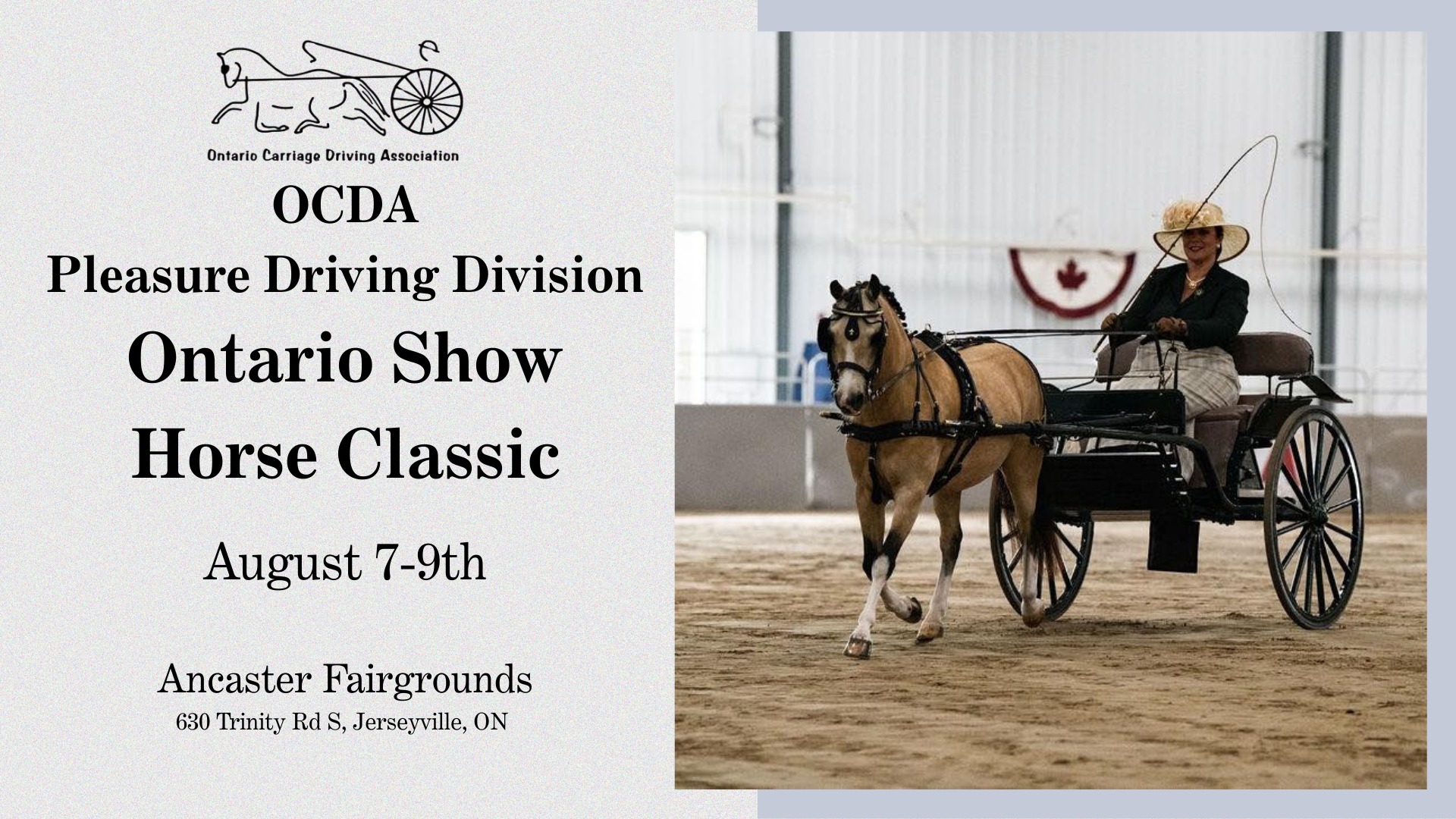 Ancaster Fairgrounds 630 Trinity Road South, Jerseyville, Ontario, CanadaThe Ontario Carriage Driving Association will be sponsoring a Pleasure Division. Join the Ontario Horse Show Classic facebook group for updates and price lists.